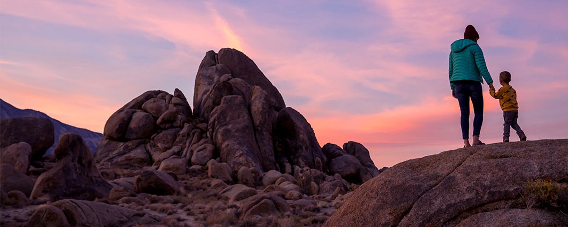 Family hiking overlooking desert valley
