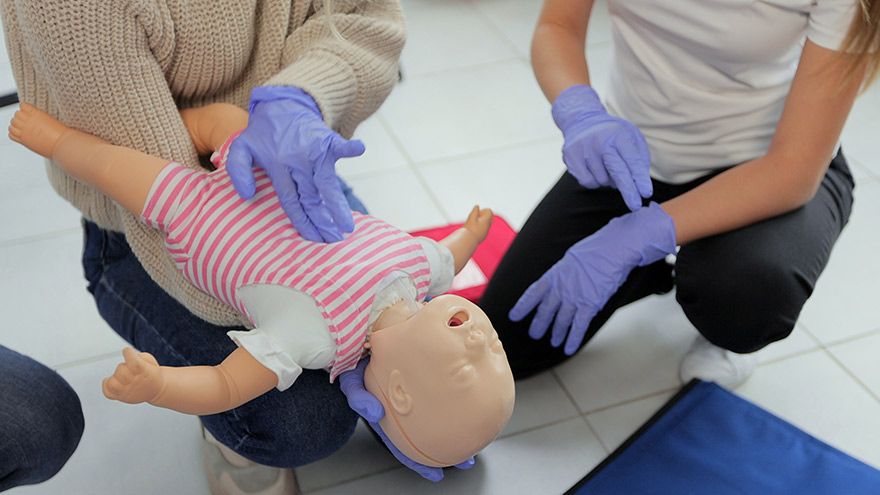 Closeup of first aid instructor using infant dummy demonstrating how to rescue a suffocating baby